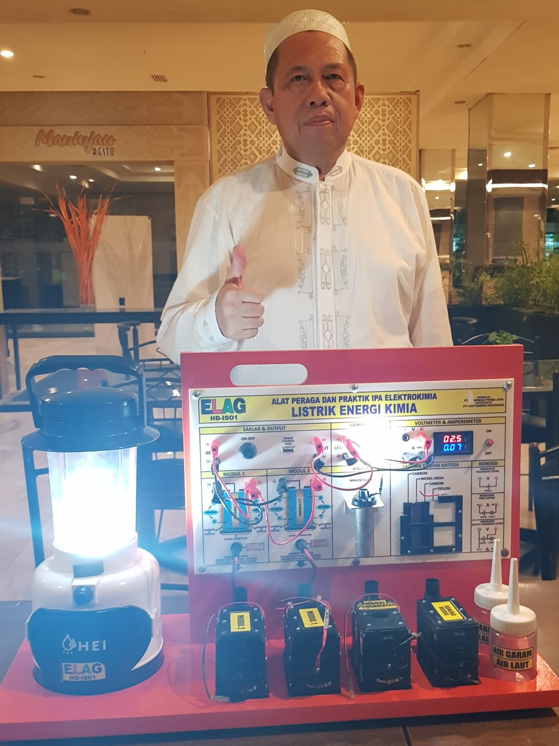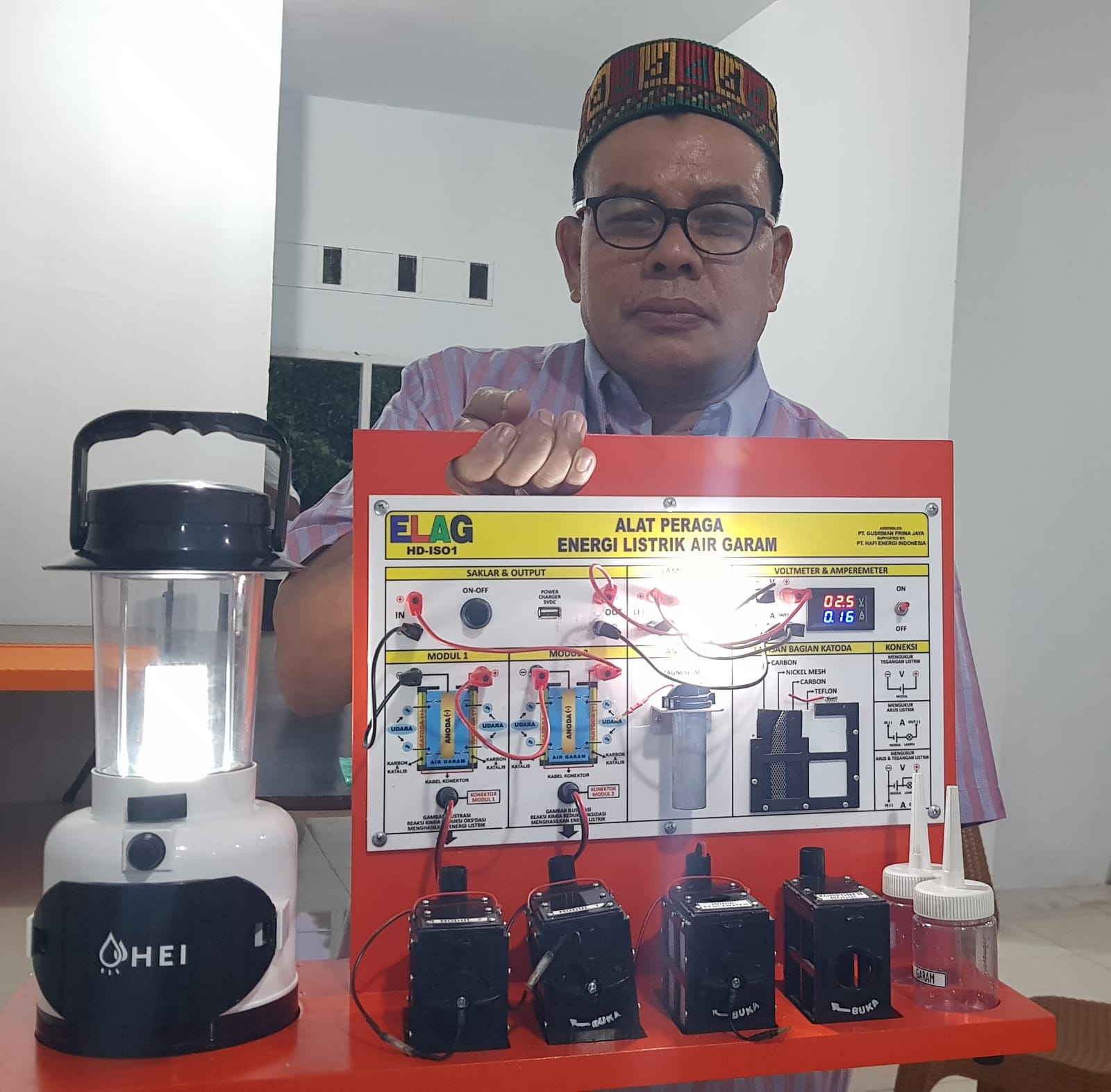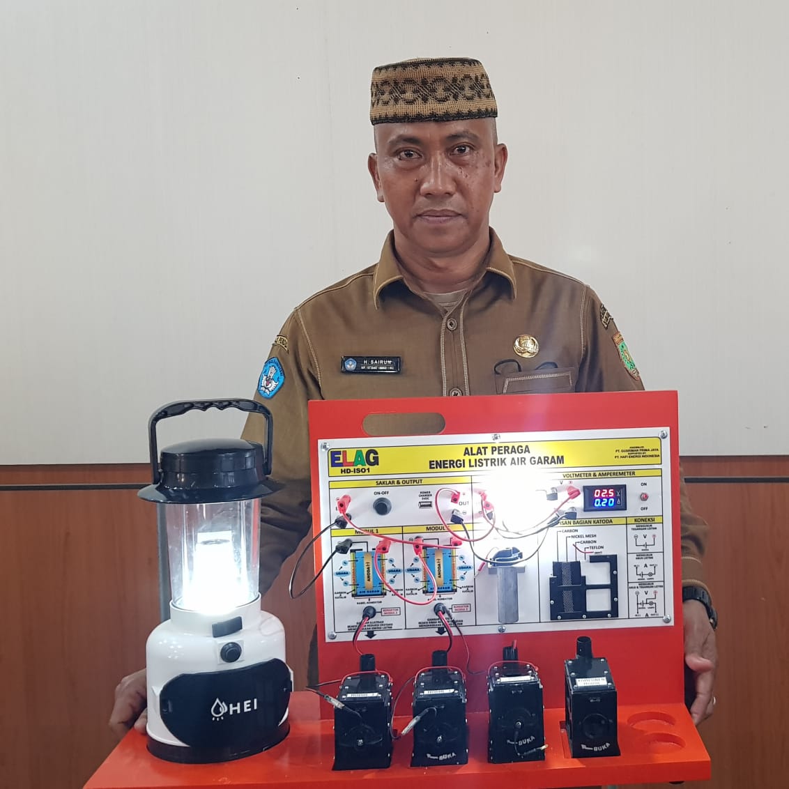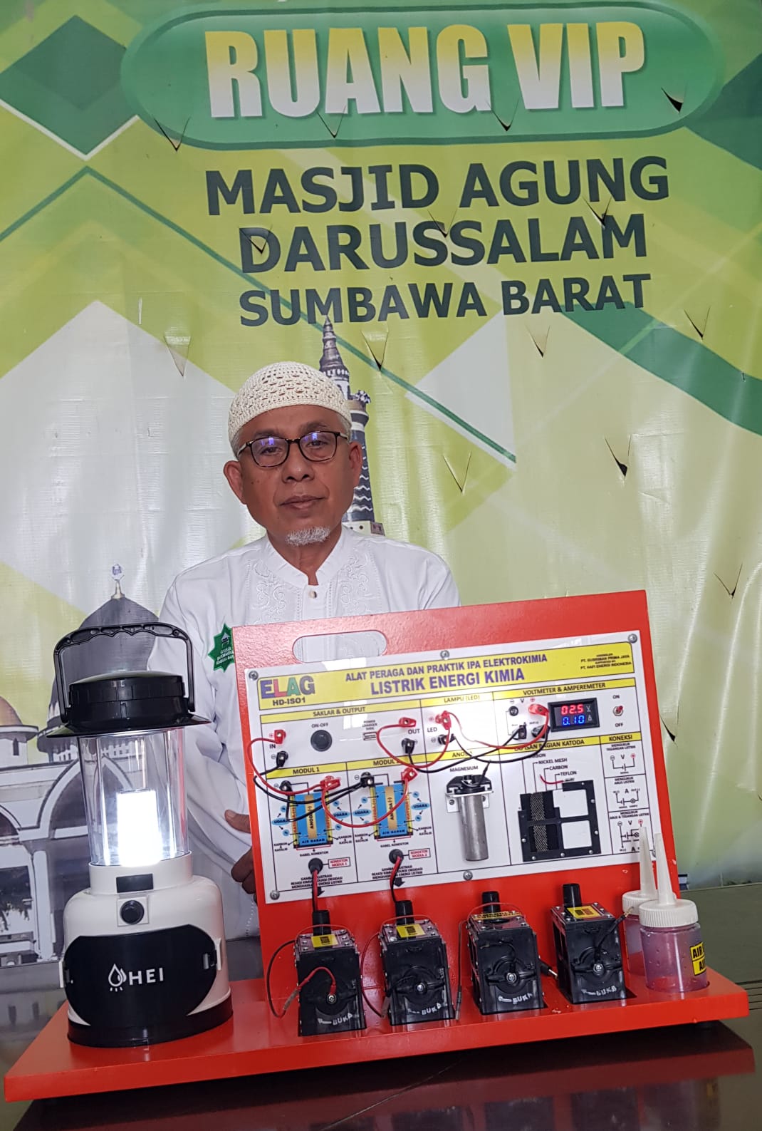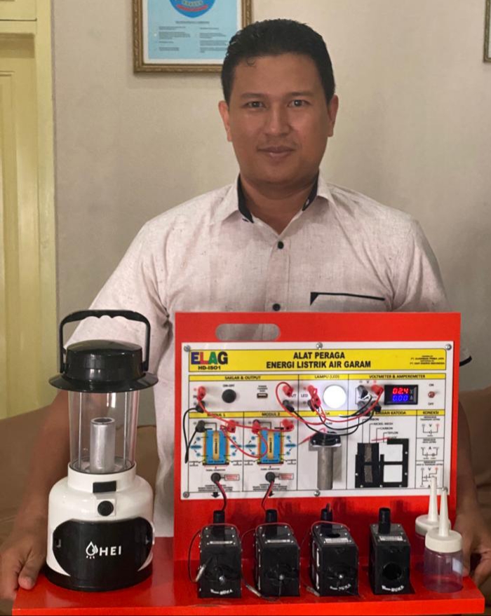 HERMANSUR, SE., M.Si. Praktisi pendidikan Provinsi Sumatera Utara memberikan testimoni Alat Peraga IPA Elektrokimia ELAG sebagai improvisasi kandungan yang tersembunyi dalam ayat Al-Quran yang berkaitan dengan energi.