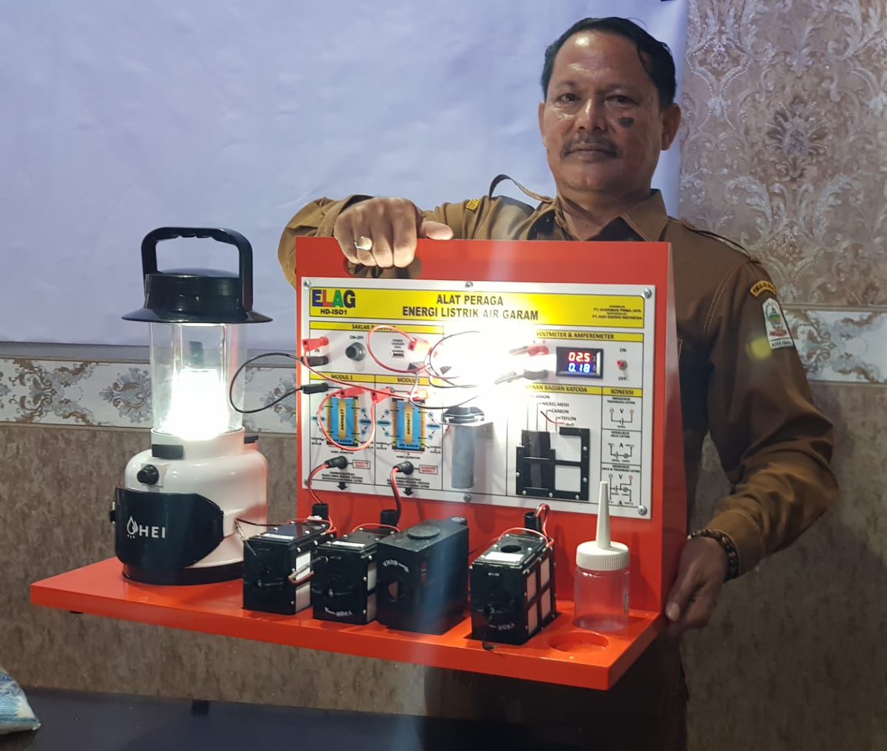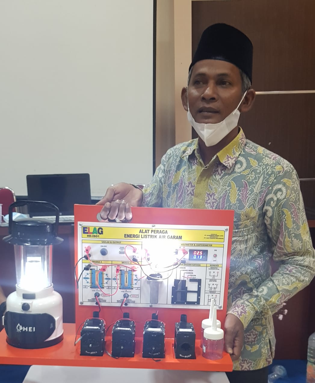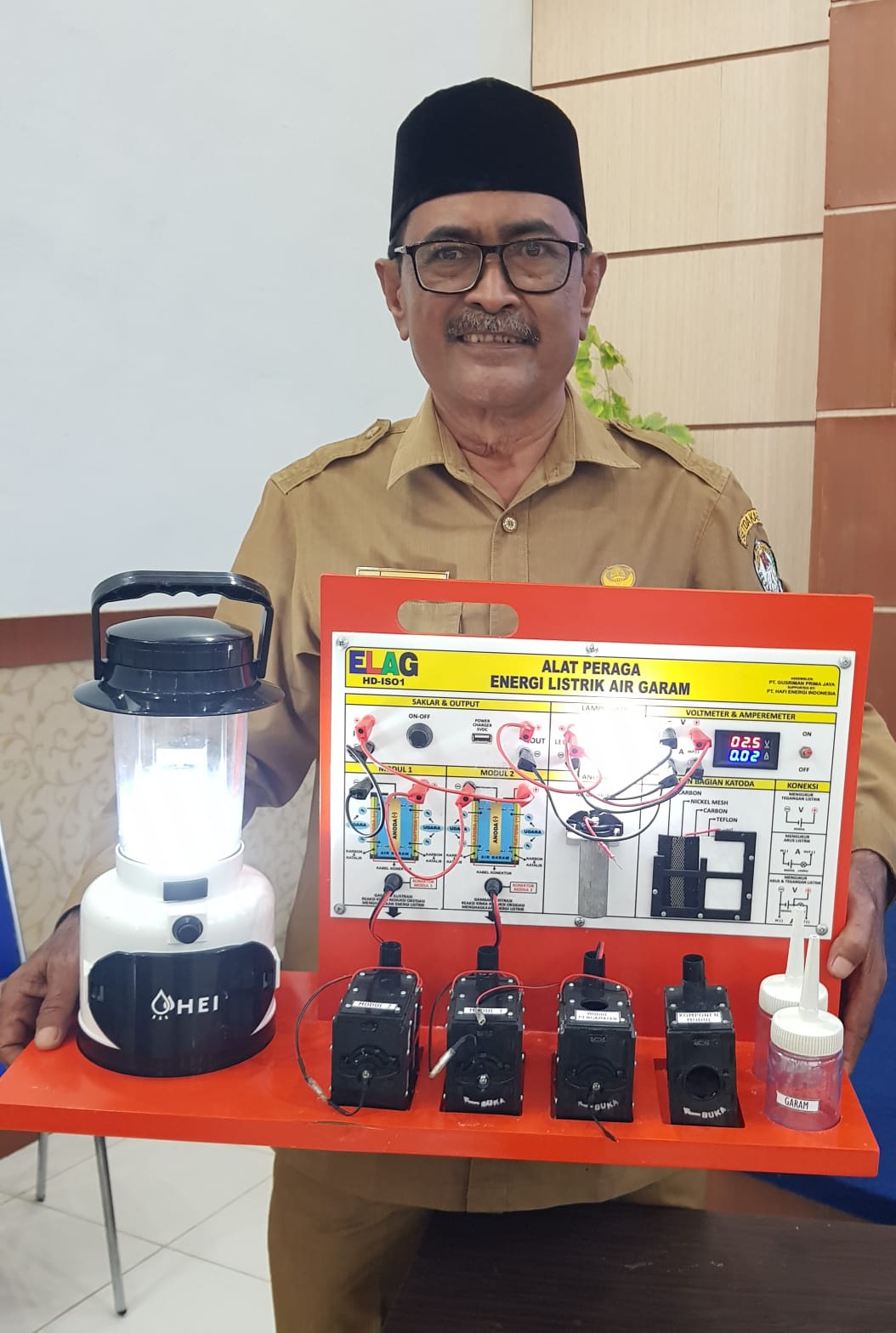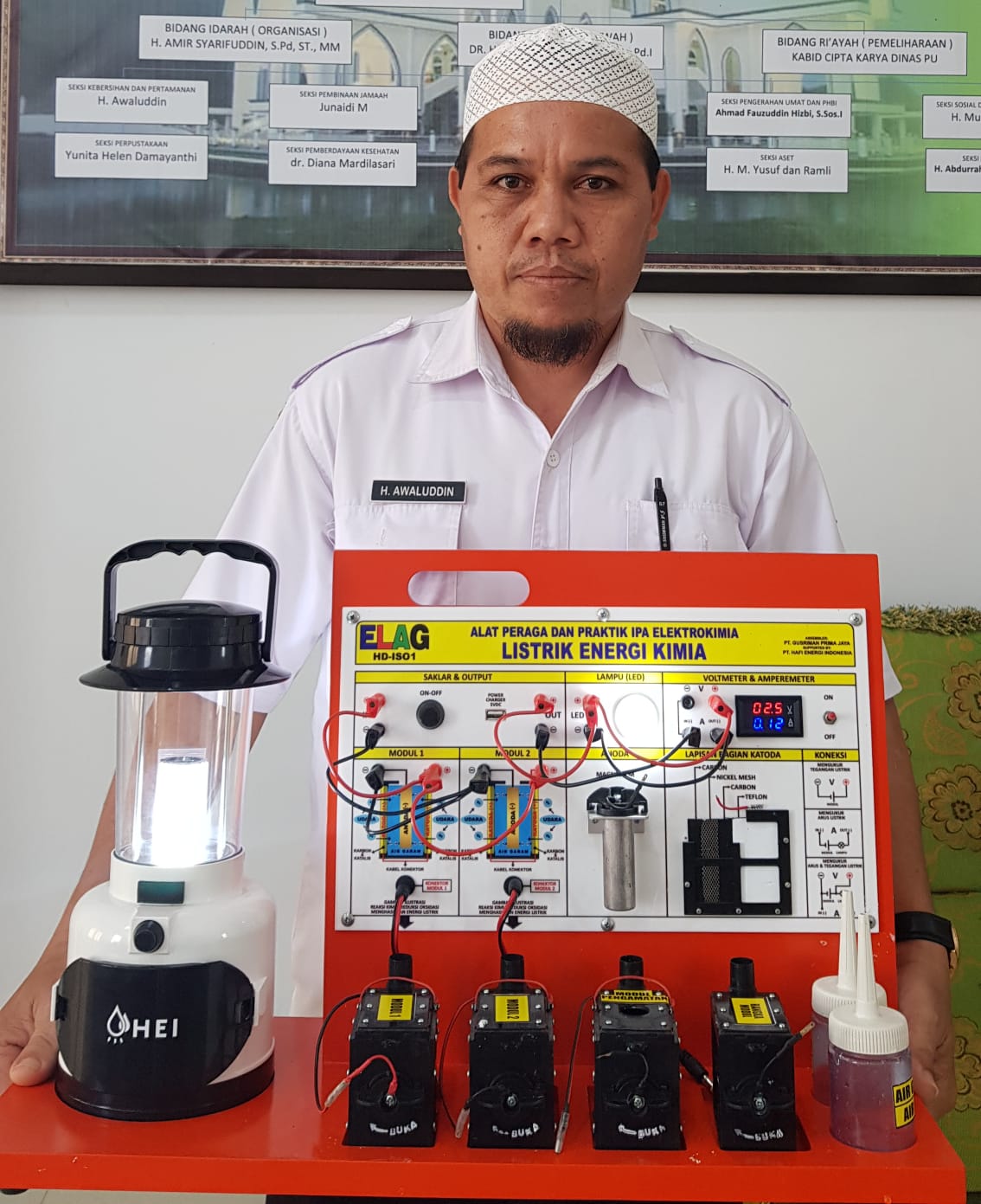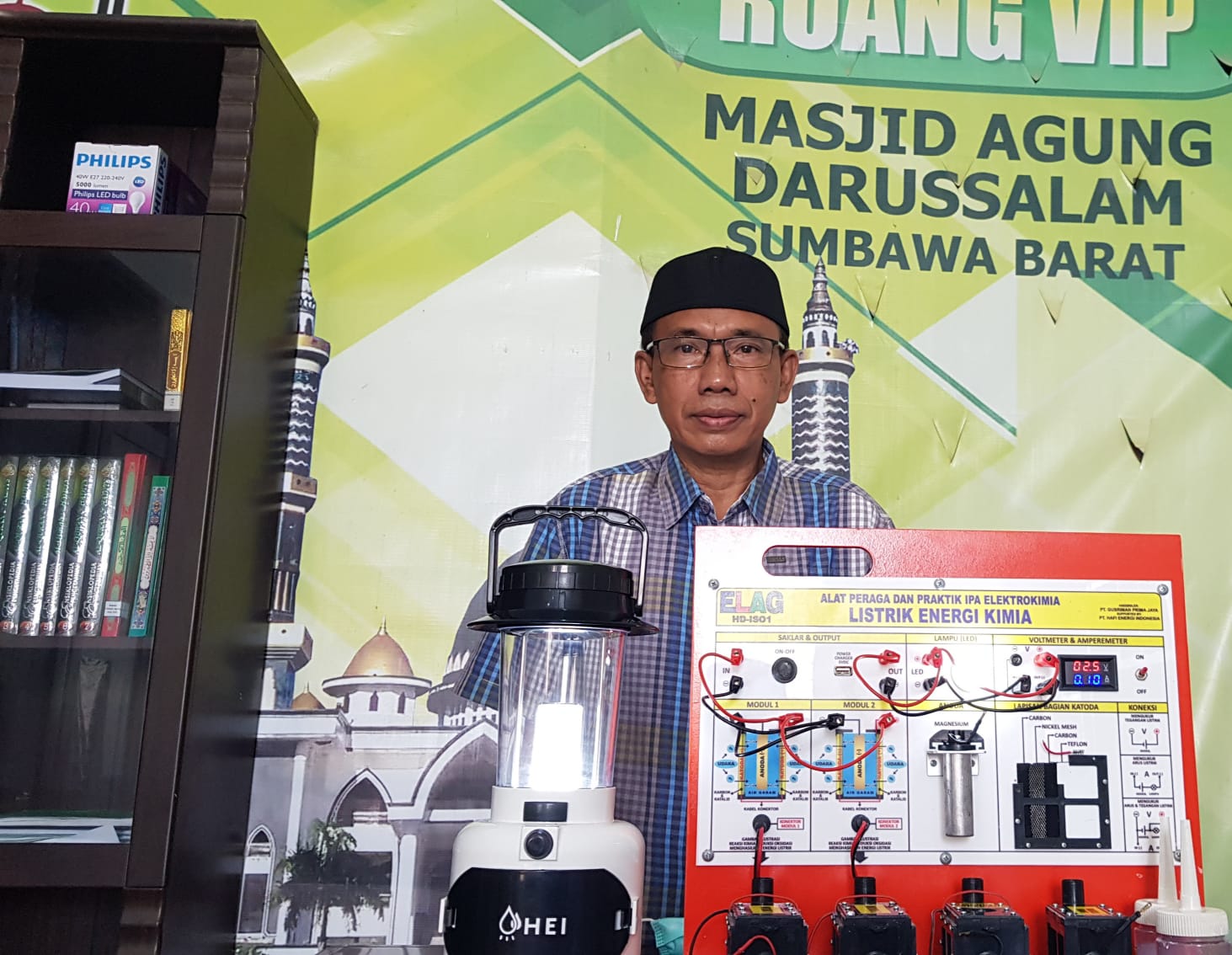 HERMANSUR, SE., M.Si. Praktisi pendidikan Provinsi Sumatera Utara memberikan testimoni Alat Peraga IPA Elektrokimia ELAG sebagai improvisasi kandungan yang tersembunyi dalam ayat Al-Quran yang berkaitan dengan energi.