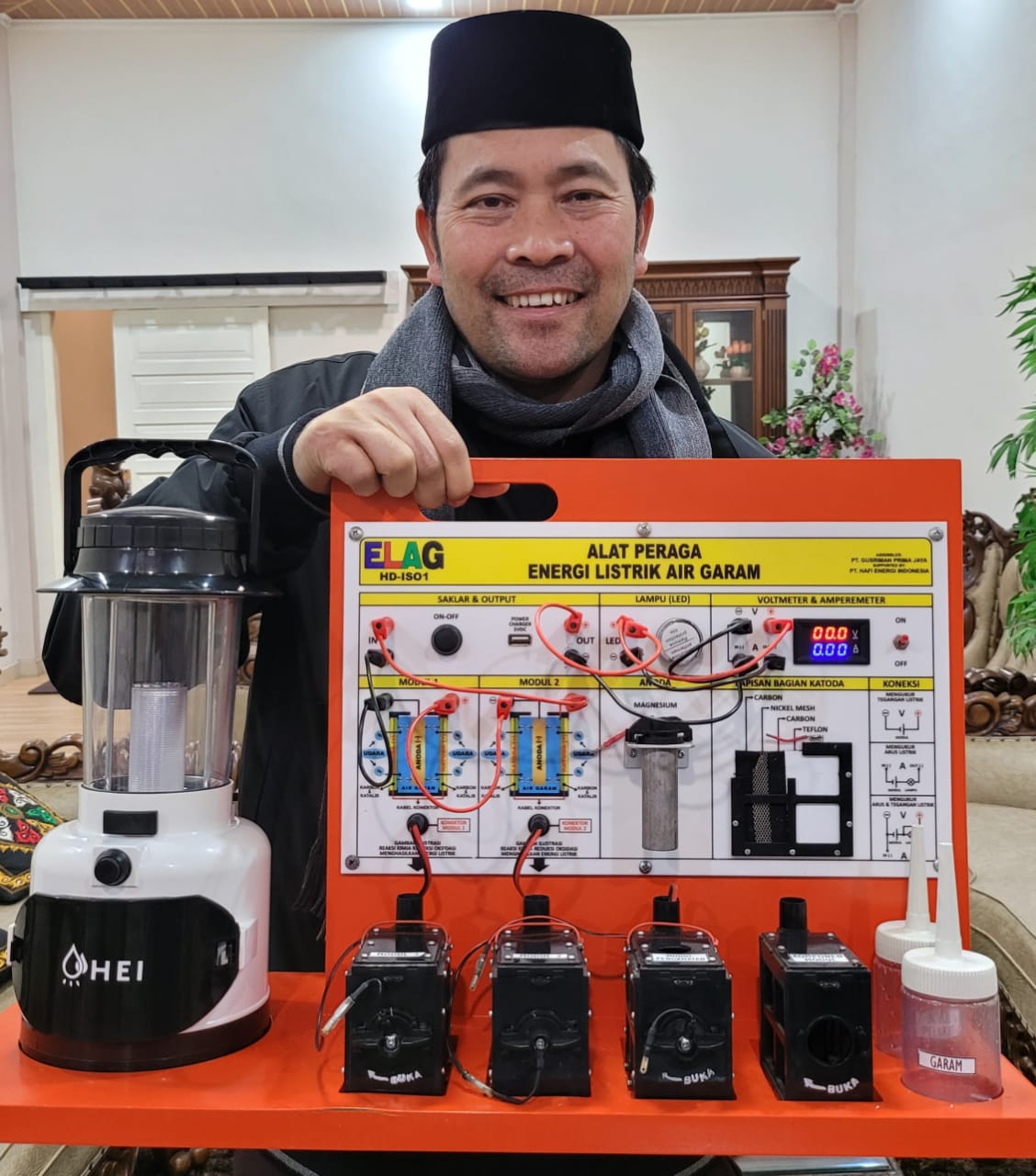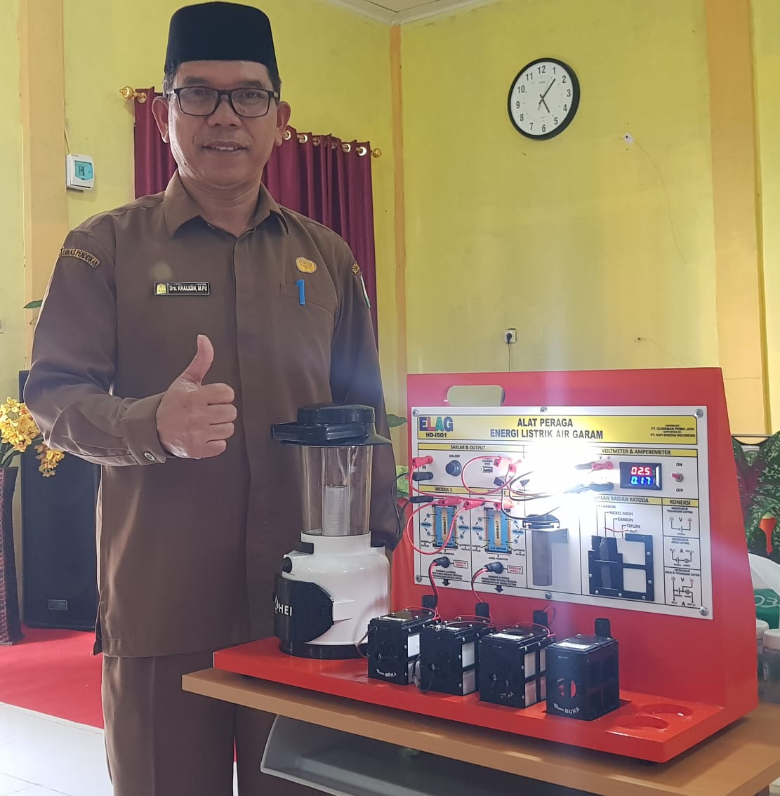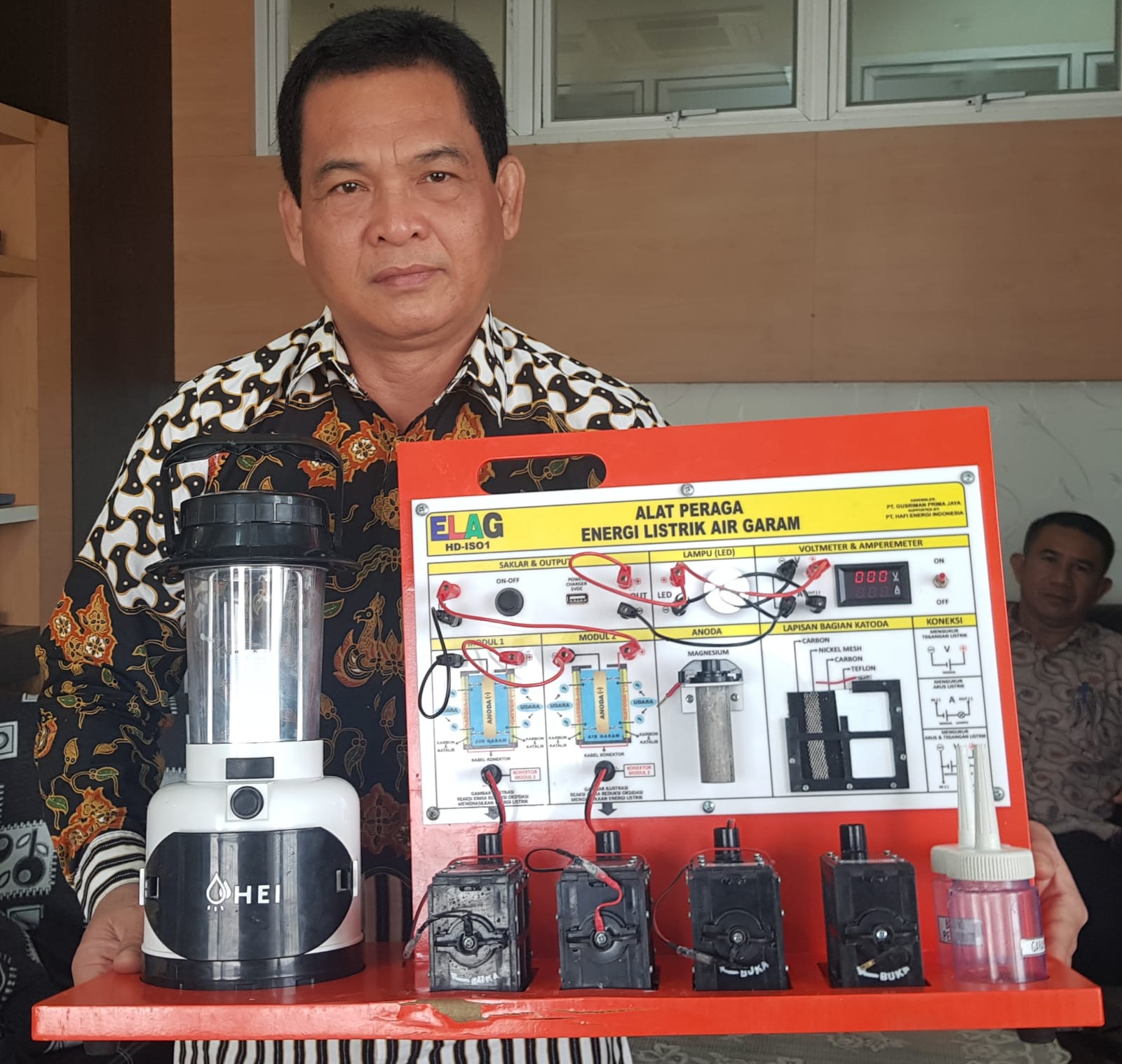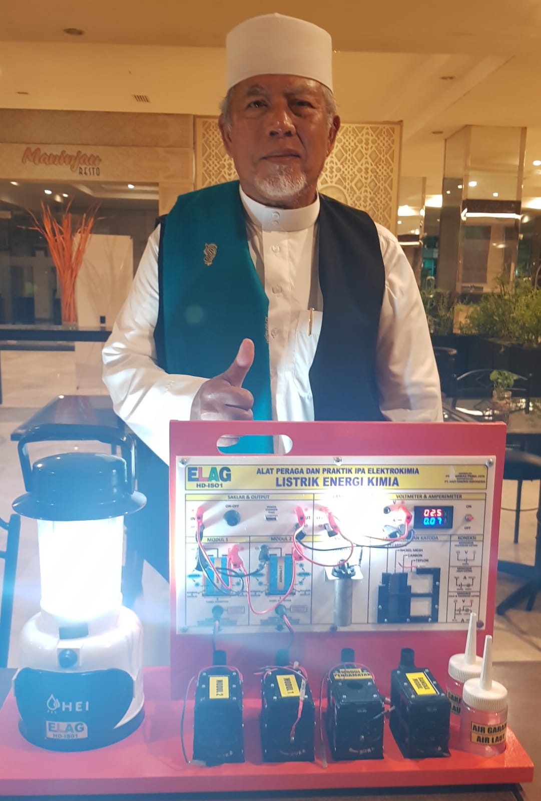 HERMANSUR, SE., M.Si. Praktisi pendidikan Provinsi Sumatera Utara memberikan testimoni Alat Peraga IPA Elektrokimia ELAG sebagai improvisasi kandungan yang tersembunyi dalam ayat Al-Quran yang berkaitan dengan energi.