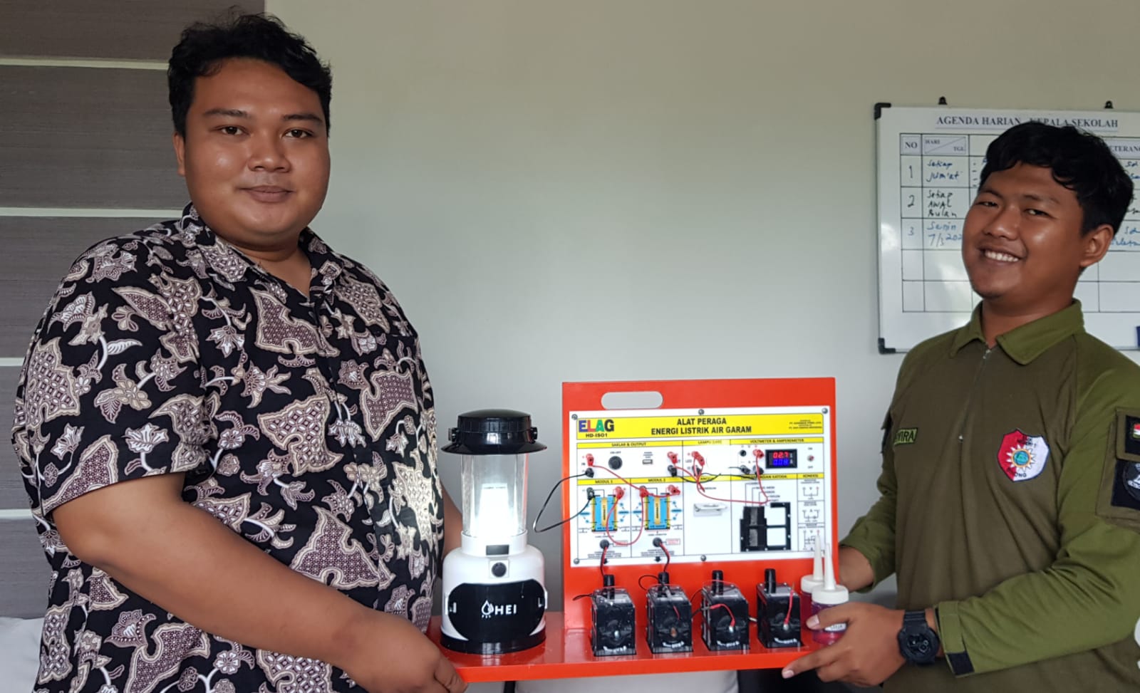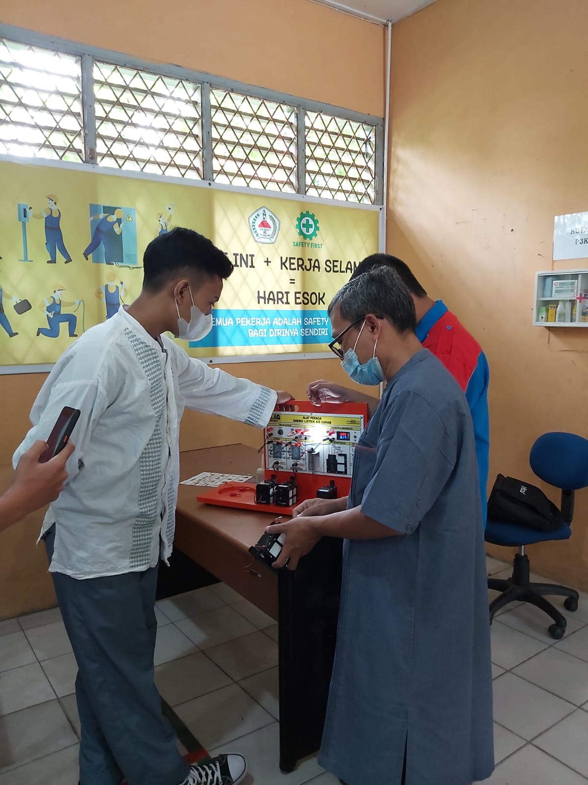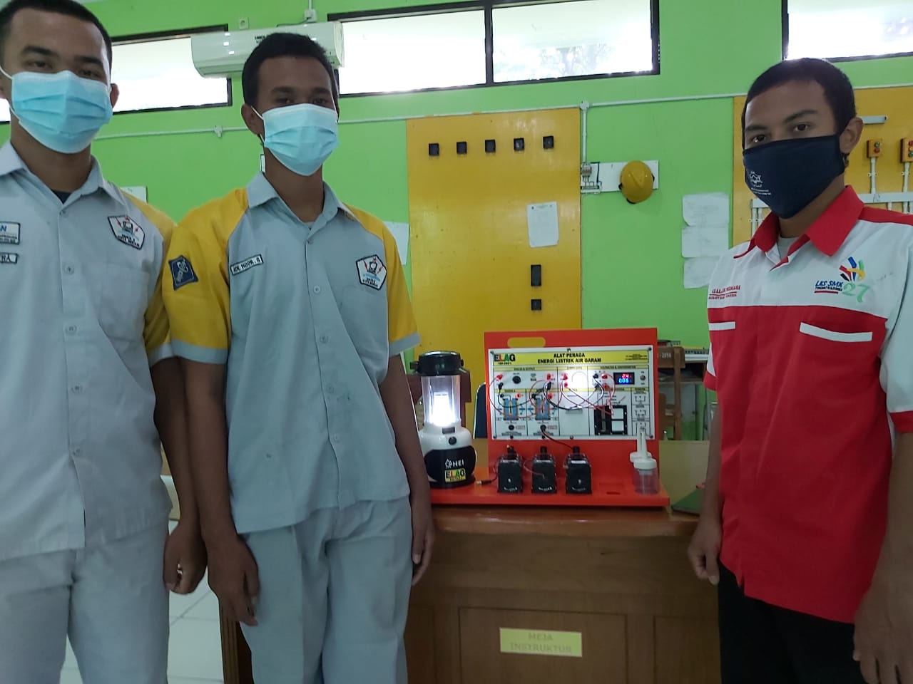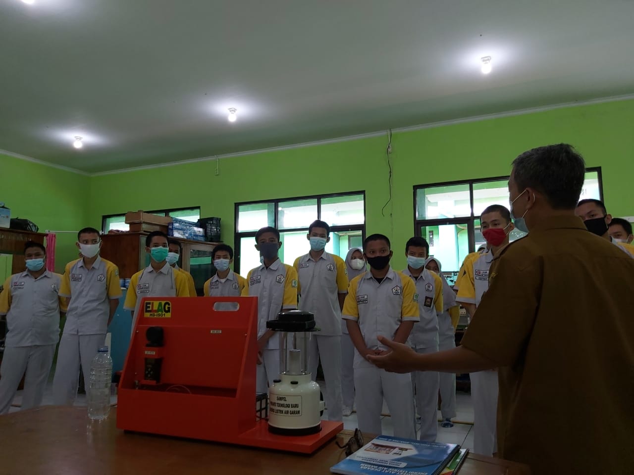 HENDRO YULIANTO, S.Pd. Wakasek Bidang Kurikulum SMKN 1 Pebayuran Kab. Bekasi bersama Dewan Guru mendemonstrasikan Alat Peraga Elektrokimia ELAG yang sangat dibutuhkan dalam pembelajaran di era merdeka mengajar dan merdeka belajar.