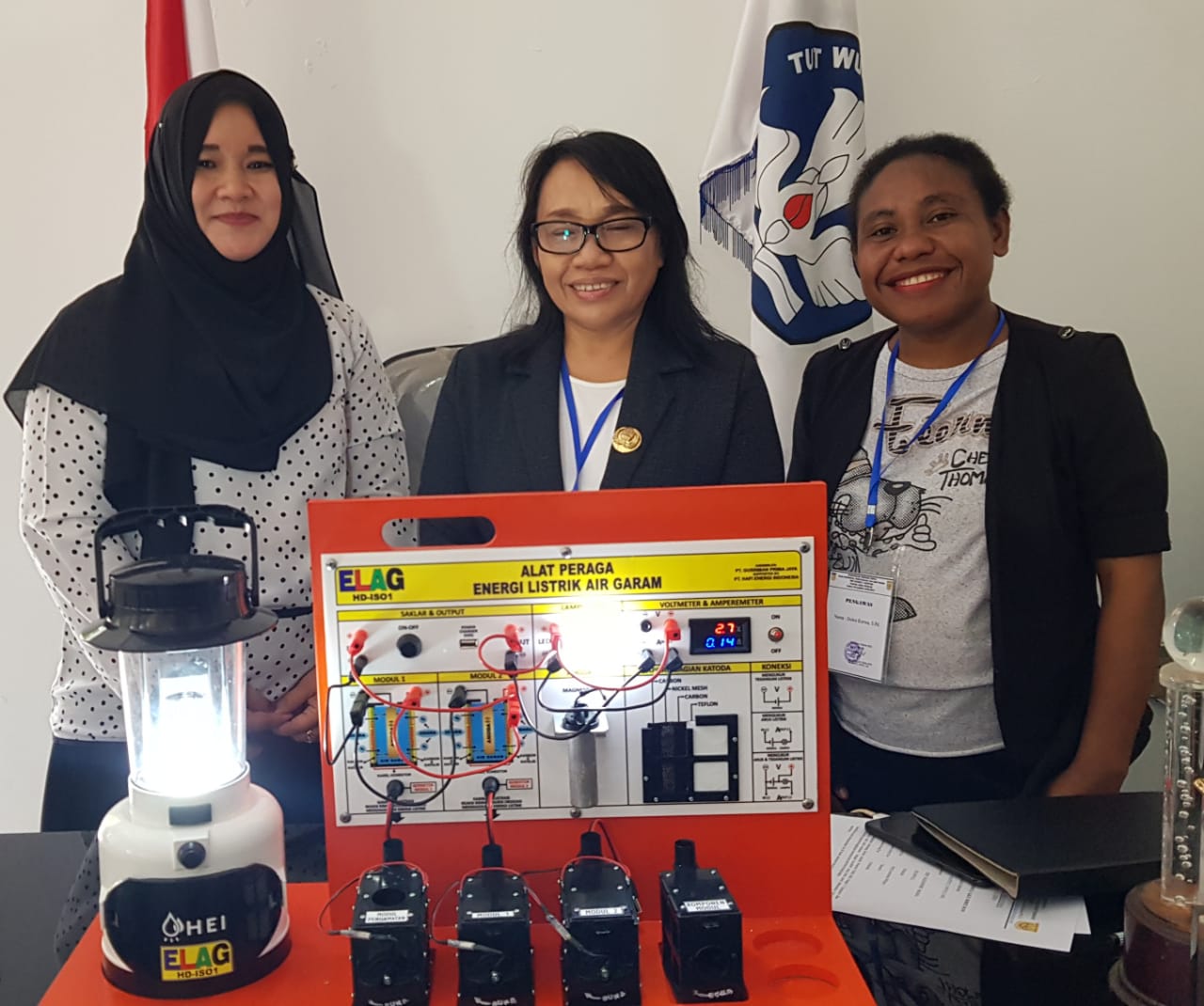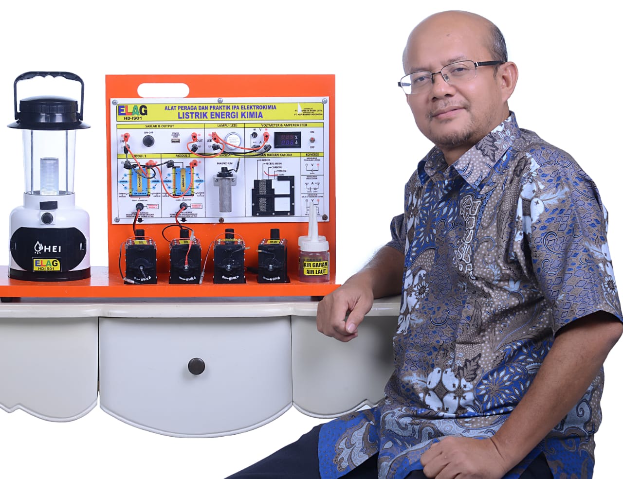 FIKA, S.Pd. Mahasiswa Magister Pendidikan Kimia FMIPA Universitas Negeri Jakarta dan NORBERTUS KRISNU P, S.Si. mencermati Alat Peraga IPA Elektrokimia ELAG dan memberikan cacatan penting antara lain : 1. Desain cantik dan menarik. 2. Penggunaan mudah dan fleksibel. 3. Banyak materi kimia yang dapat dipelajari. 4. Dapat menjadi solusi energi kimia hijau. 5. Sumber inspirasi pembelajaran kimia terapan yang kontekstual.