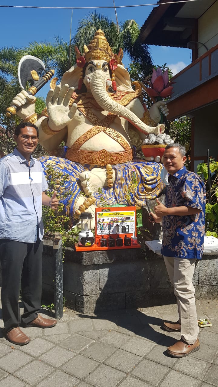 Konsultan PT. GUSRIMAN PRIMA JAYA, REBO, SPd., MPd. (kanan) bersama WIJI LAKSONO, SPd. Guru SMKN 2 DENPASAR, BALI (kiri) diabadikan di halaman SMKN 2 DENPASAR pasca testimoni Alat Peraga IPA ELAG
