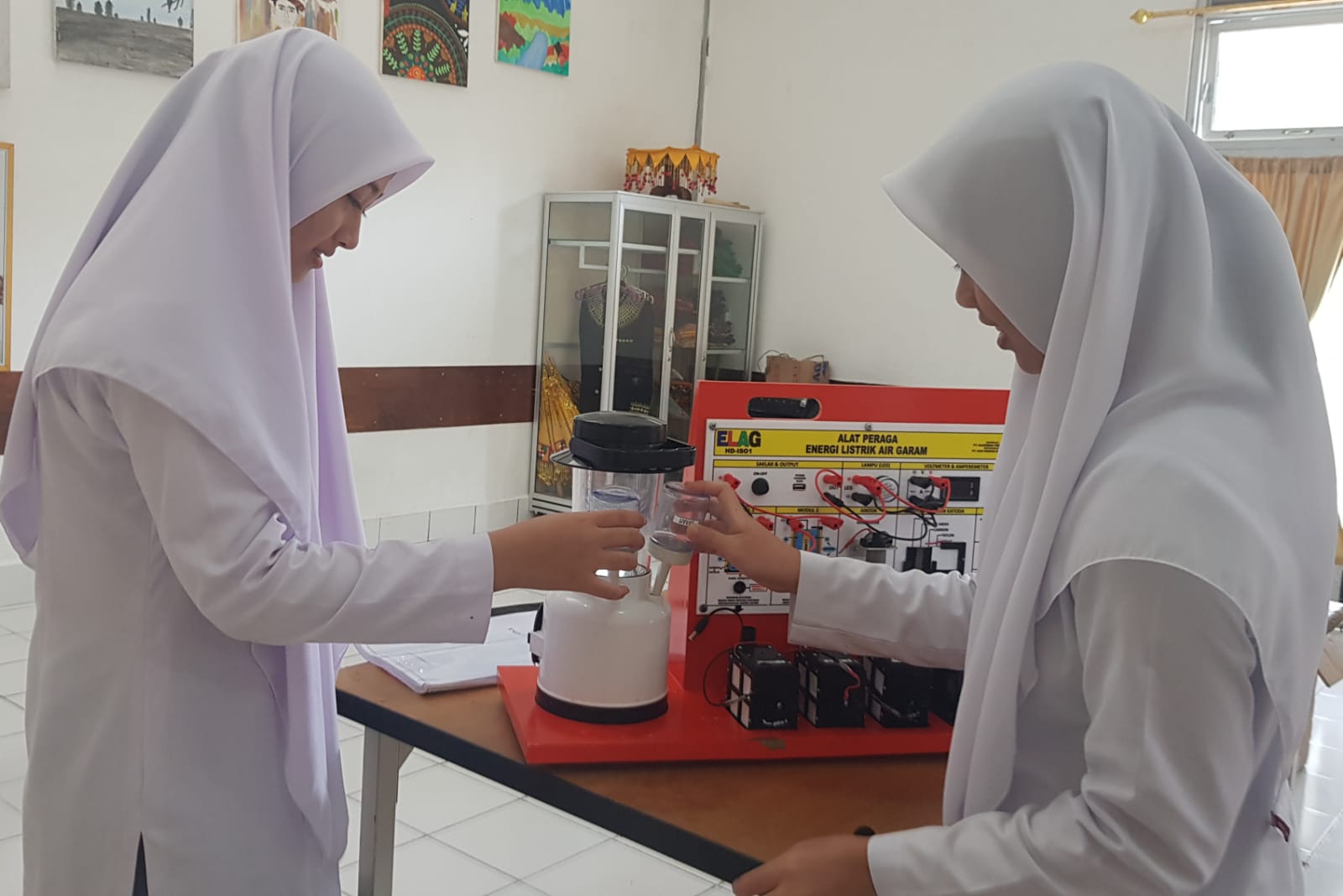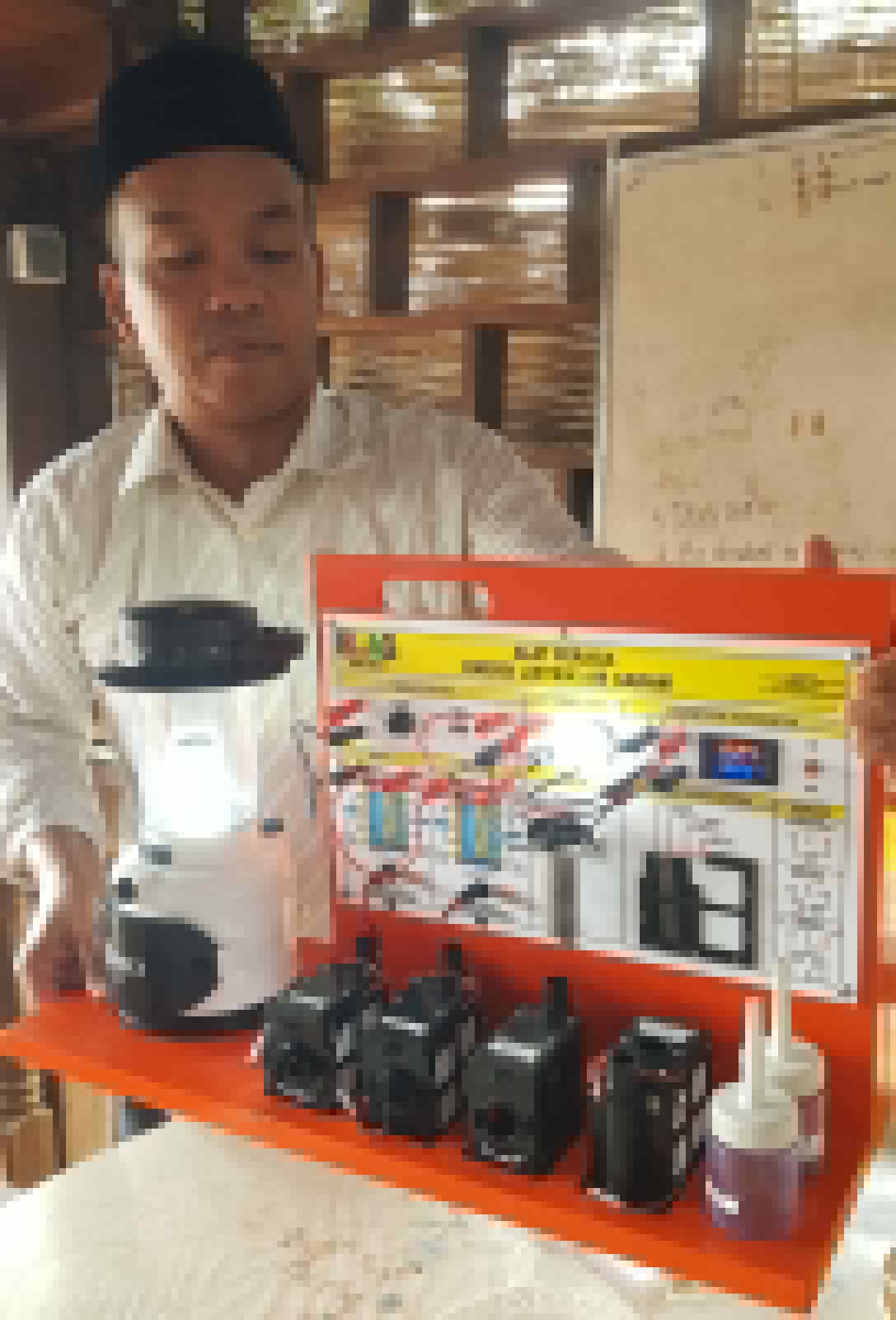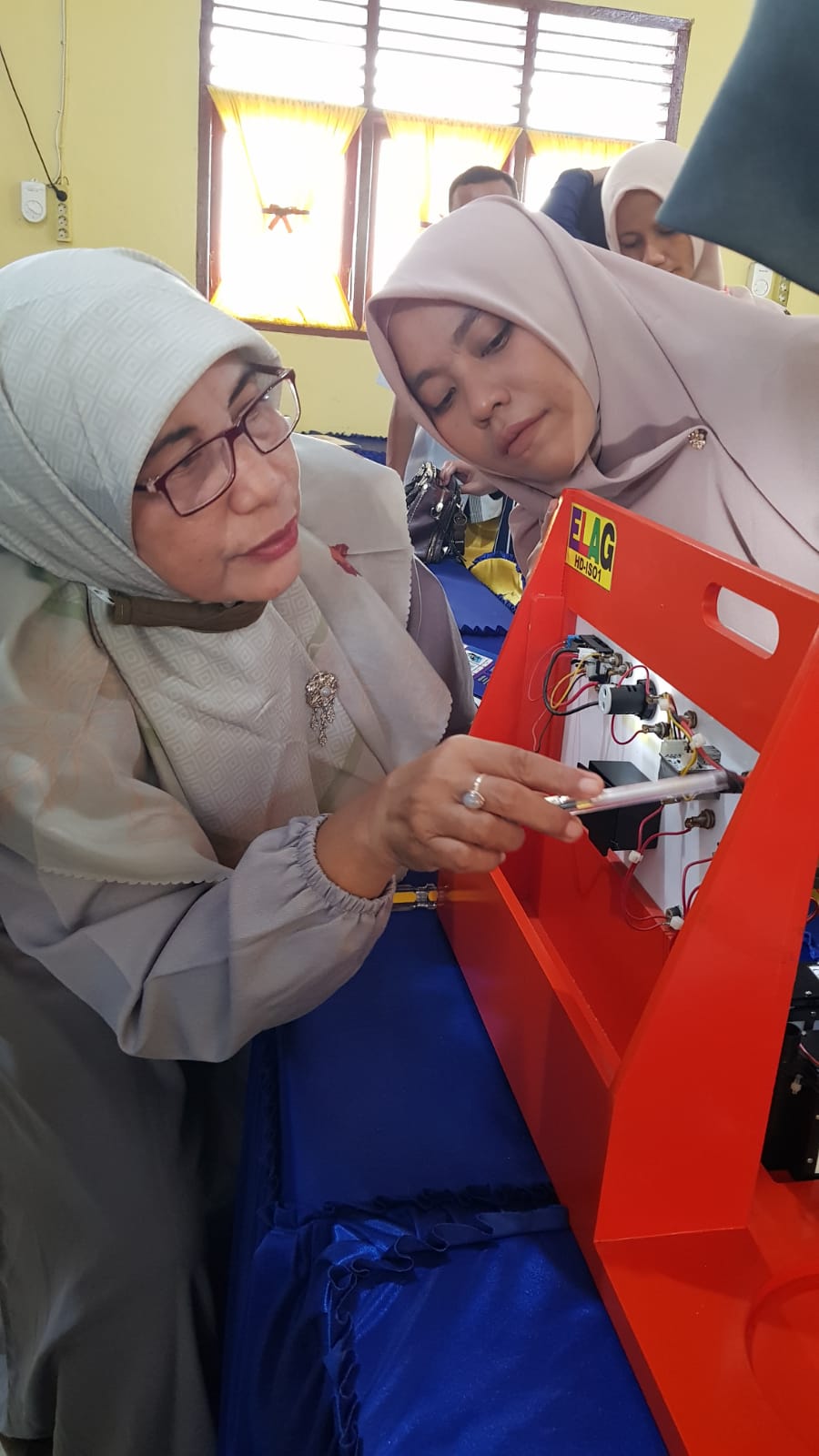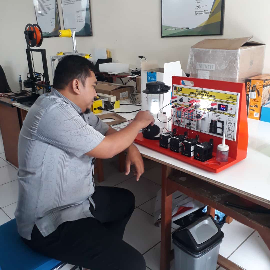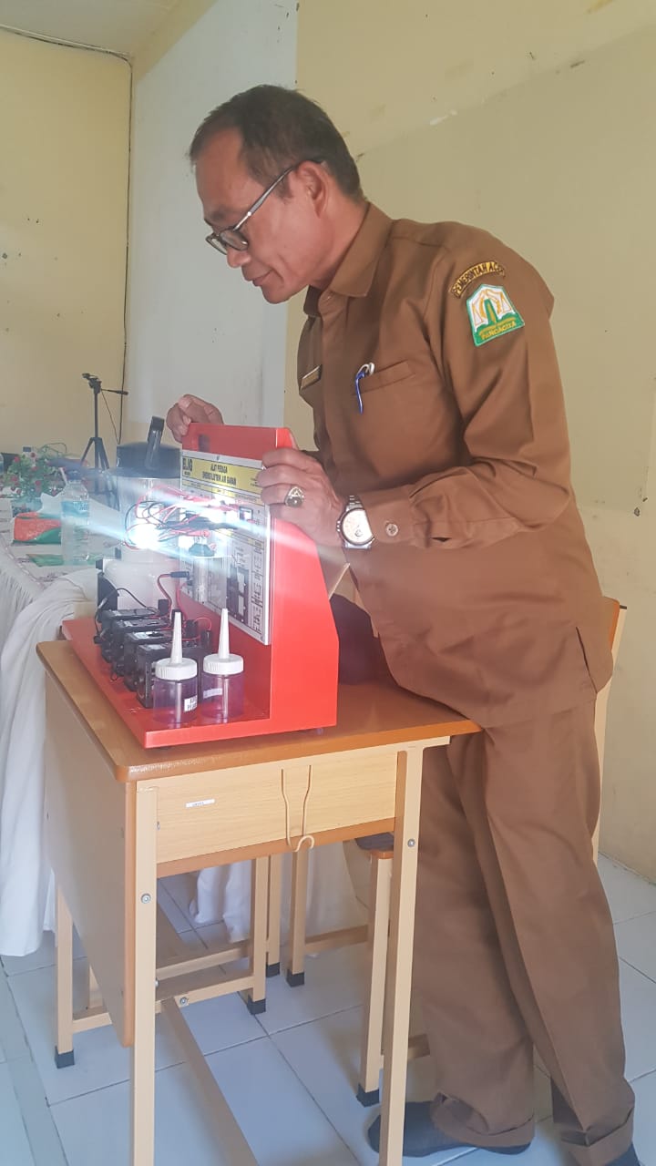 GURU Fisika dan Kimia di Aceh Timur memeriksa komponen Alat Peraga IPA ELAG dengan cermat.