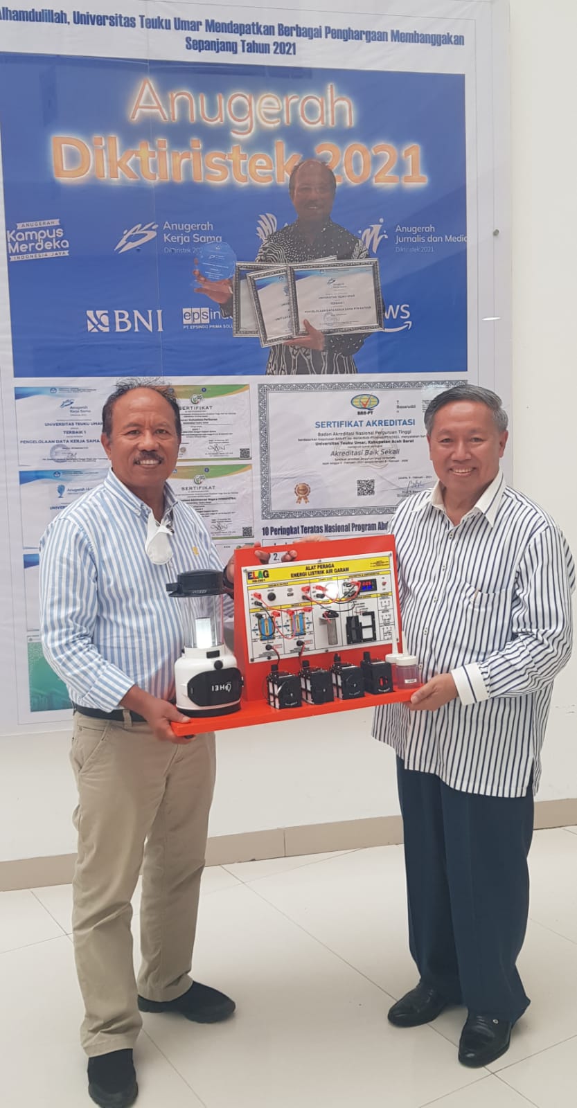 Rektor Universitas Teuku Umar Prof. DR. JASMAN J. MA'RUF, SE.,MBA (kiri) memberikan deskripsi Alat Peraga IPA ELAG sebagai piranti yang dapat mengembangkan kreativitas berfikir mahasiswa dalam merancang produk baru di masa depan