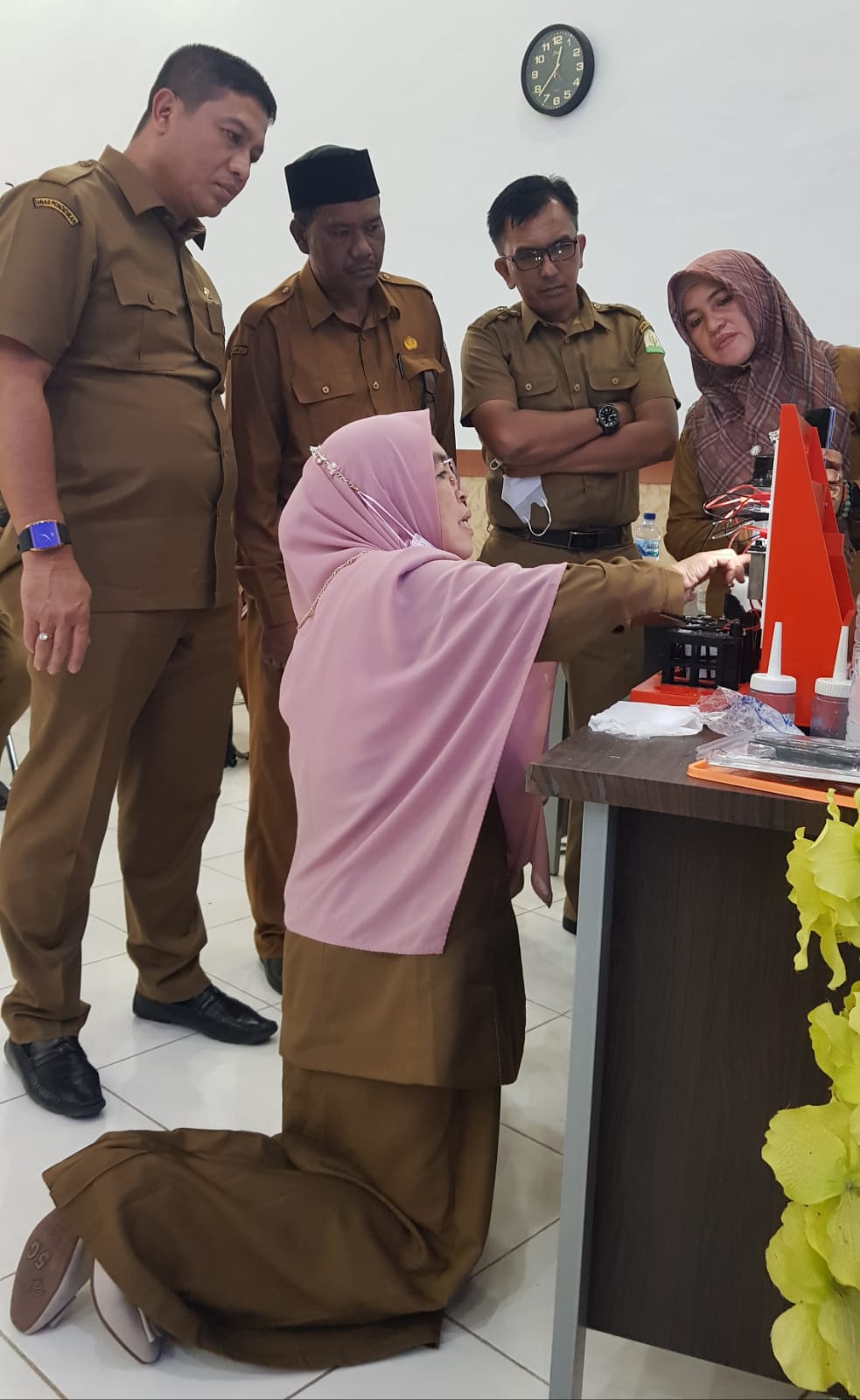 Kepala Cabang Dinas Pendidikan Aceh Wilayaj Kabupaten Bireuen sedang mengamati secara serius Alat Peraga IPA ELAG.