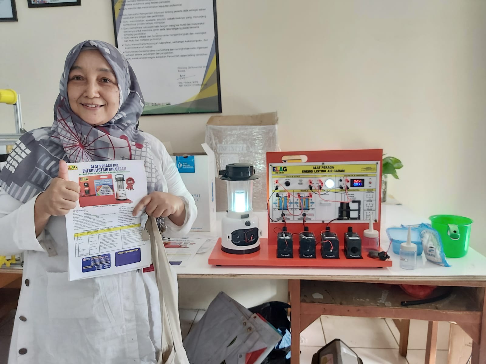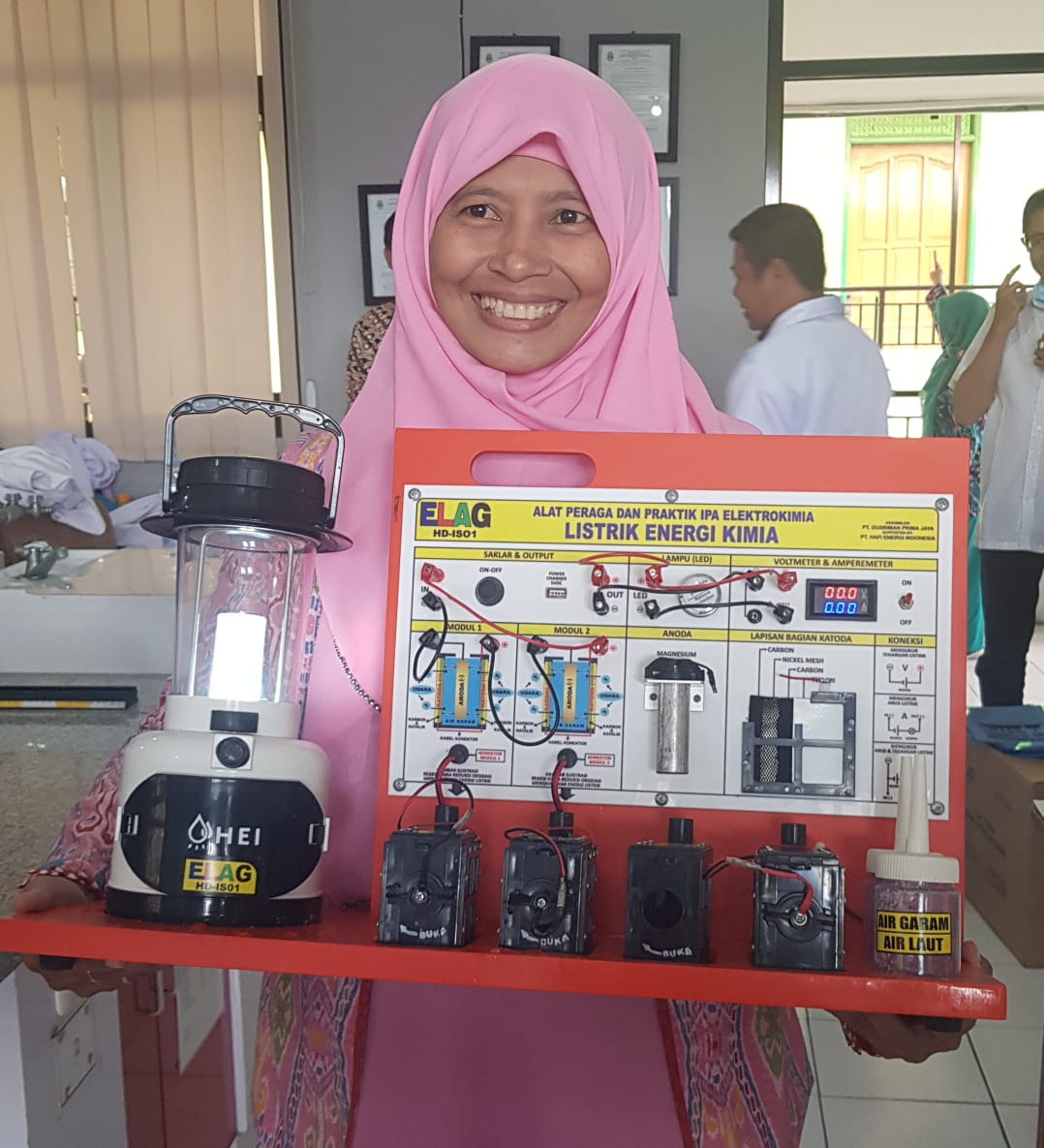 NENENG SADAH, S.Pd. Guru IPA MTs. Wahid Hasyim Pati, Jawa Tengah memberikan testimoni bahwa Alat Peraga Elektrokimia ELAG "kelihatan sederhana, tetapi dibuat dengan pemikiran yang detail".