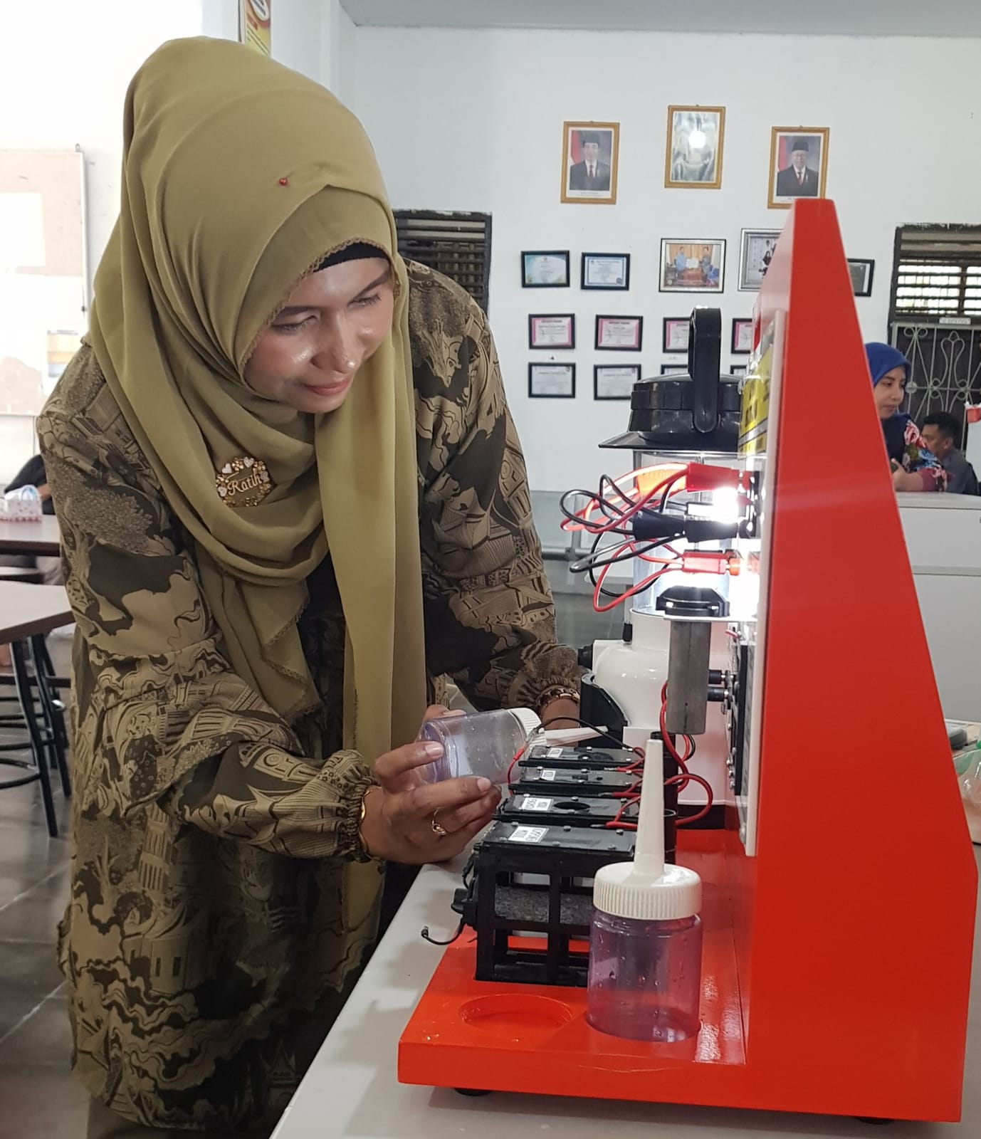 Kepala SMKN Sukoharjo, Kab. Pringsewu Provinsi Lampung ENY SETYAWATI, S.T., M.Pd. mengamati secara seksama Alat Praktik IPAS Elektrokimia Listrik Energi Kimia dalam sebuah kegiatan strategis SMKN Sukoharjo 07-12-2022.