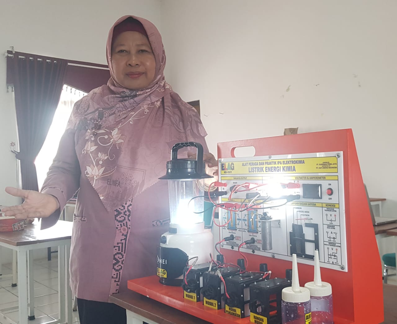 RAHMAINI TANJUNG, S.Pd. Guru Kimia MAS Proyek Univa Medan, Sumatera Utara menuturkan Alat Peraga ELAG dapat merubah asumsi orang awam, guru dan siswa yang selama ini dalam pembelajaran kimia hanya secara abstrak, kini nyata tervisualisasi.
